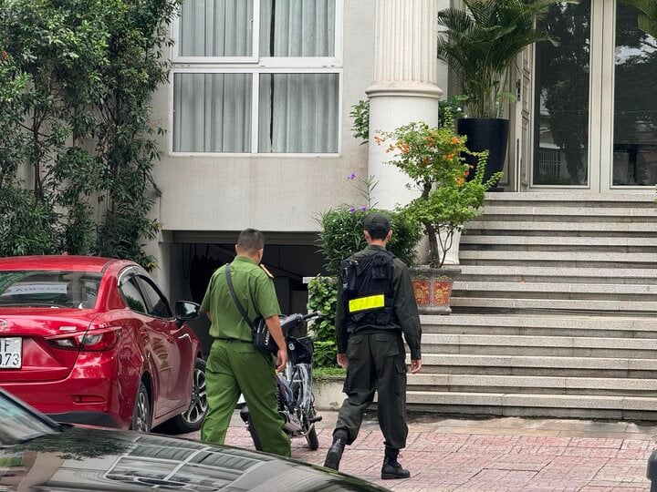 Theo Pháp luật TP.HCM, bên ngoài, nhiều xe công vụ biển xanh của Bộ Công an dừng đậu bên đường. Phía trong, cảnh sát làm việc.