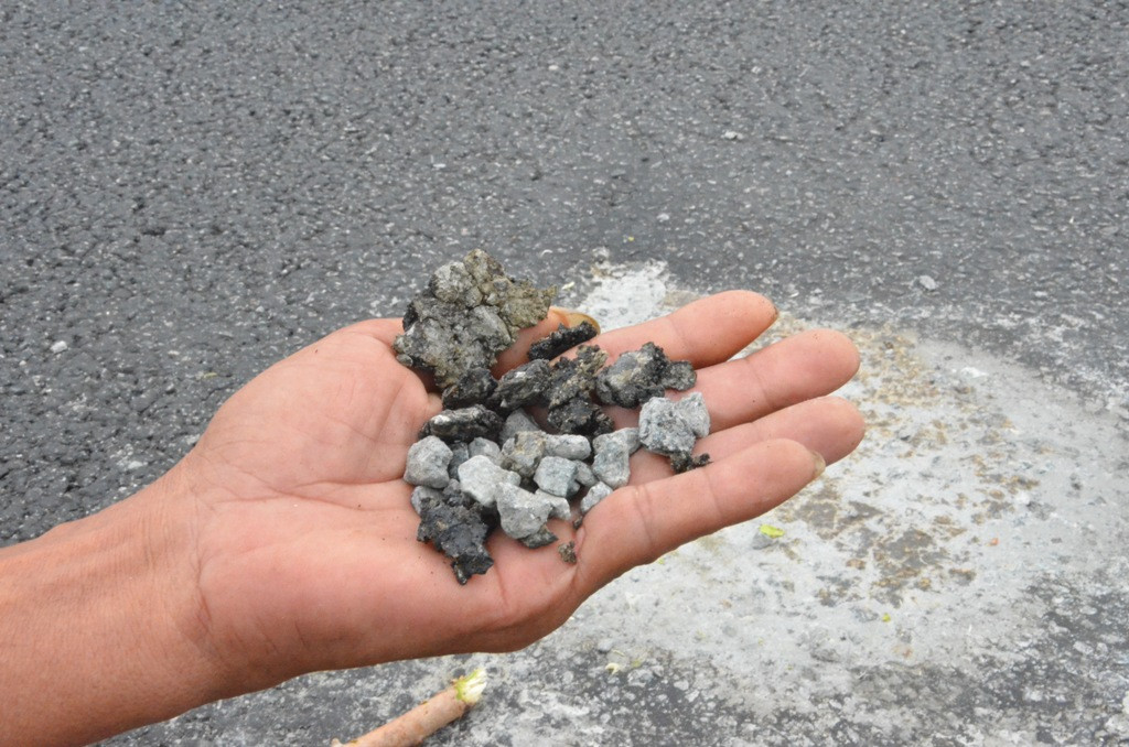 “Một điểm bong tróc rất lớn nhưng đã được trám lại bằng bê tông, mặt bê tông vẫn còn rất mới, điểm bong tróc này vừa được trám bê tông vào sáng 27/11 nhưng đã bắt đầu hư hỏng trở lại”- ông Phạm Tấn Lực trú thôn Phú Lễ (xã Bình Trung) cho biết.
