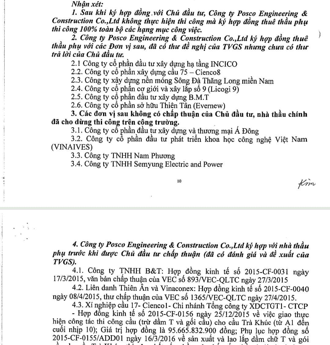 Biên bản của đoàn thanh tra bộ GTVT nhận xét, sau khi ký hợp đồng với chủ đầu tư, công ty Posco Engineering & Construction Co.,Ltd không thực hiện thi công mà ký hợp đồng thuê thầu phụ thi công 100% toàn bộ các hạng mục công việc.