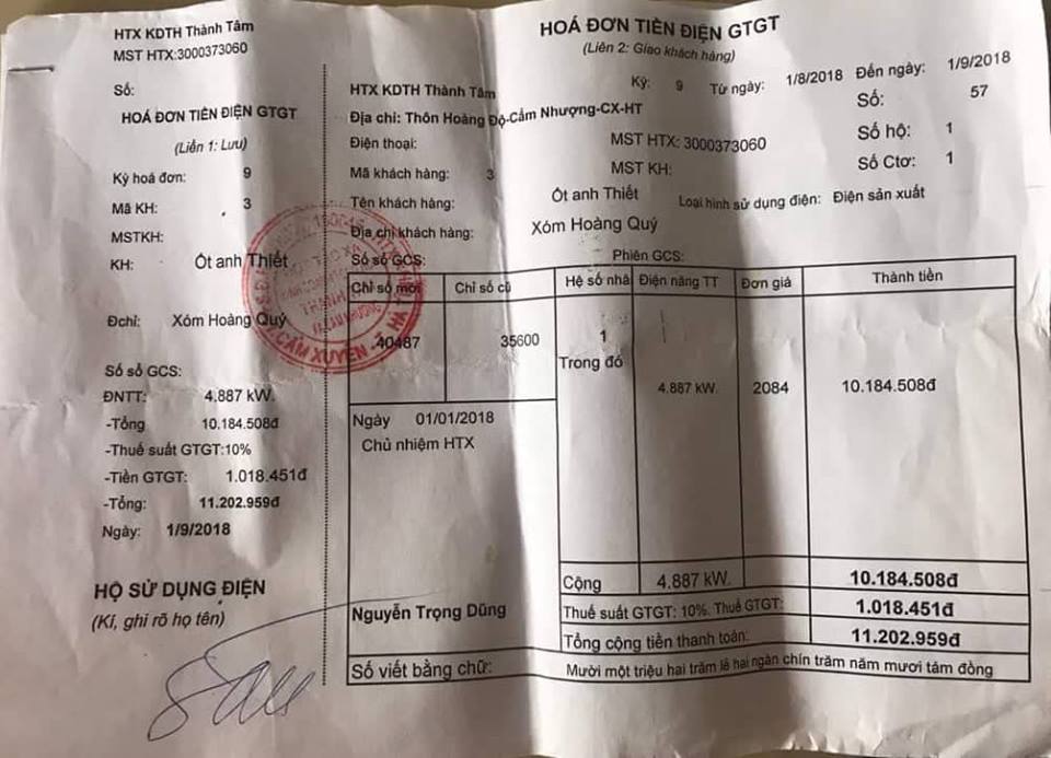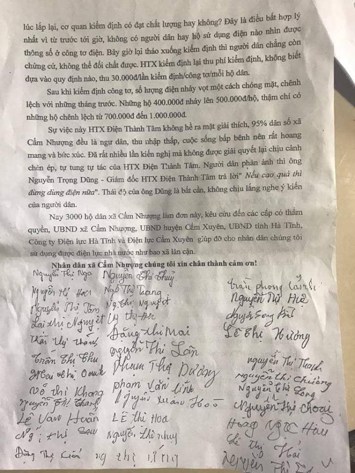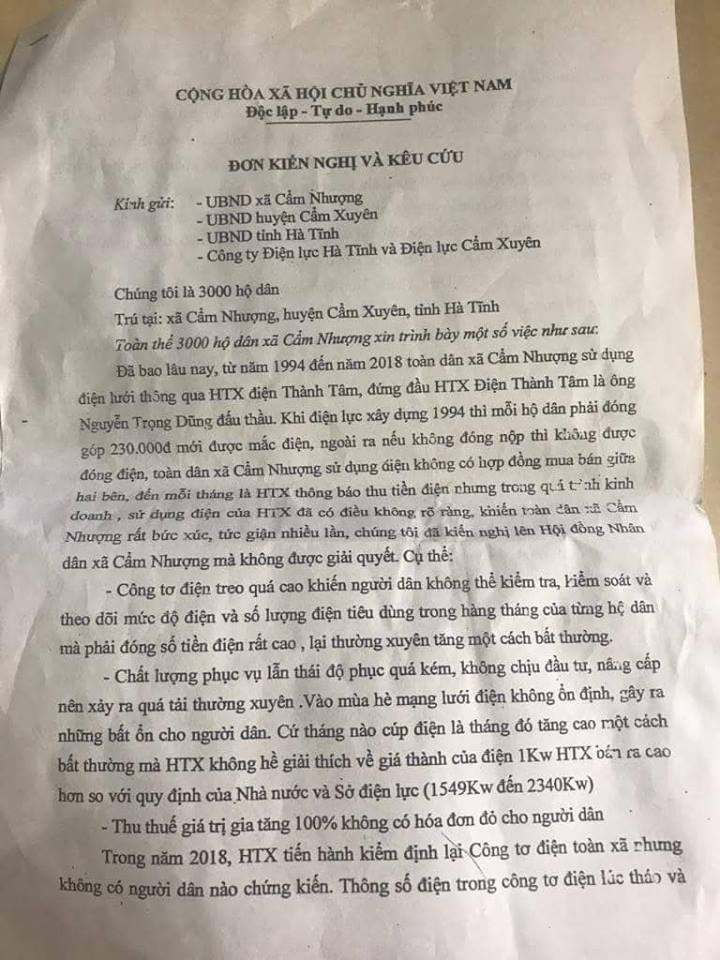 Như đã phản ánh trước đó, vào ngày 13/9, cho rằng, tiền điện thời gian gần đây bỗng tăng bất thường, bức xúc, chị Nguyễn Thị Hoa (SN 1982), trú tại xóm Tân Hải, xã Cẩm Nhượng đã viết lên trang facebook cá nhân. Cùng chung nỗi niềm nên sau khi chị Hoa đăng tải, nhiều người dân cũng đã vào bình luận. Bất ngờ, ngay sau đó, chị Hoa và những người dân tham gia bình luận này đều nhận được thông báo cắt điện của HTX Thành Tâm với lý do vì đã chỉ trích, bình luận trên facebook.
