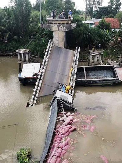 "Đang nằm trong nhà, tôi nghe một cái ầm, hoảng hồn chạy ra thì thấy cầu bị sập. Ba người trên các xe bị kéo theo xuống kênh, nhanh chóng leo lên bờ", một nhân chứng cho biết.