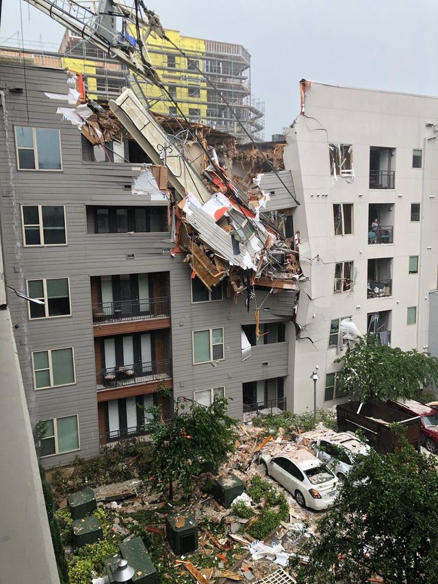 Một đoạn video do người dân ghi lại cho thấy cần trục bị gió thổi rơi xuống khu nhà phức hợp Elan City Lights, theo KTVT-TV. Isaiah Allen, người sinh sống trong khu nhà, mô tả khoảnh khắc vụ việc diễn ra như sấm sét đánh trúng tòa nhà. Allen cho biết anh đã chứng kiến một người phụ nữ đầy máu me bị mắc kẹt trong căn hộ của bà ở tầng 2.