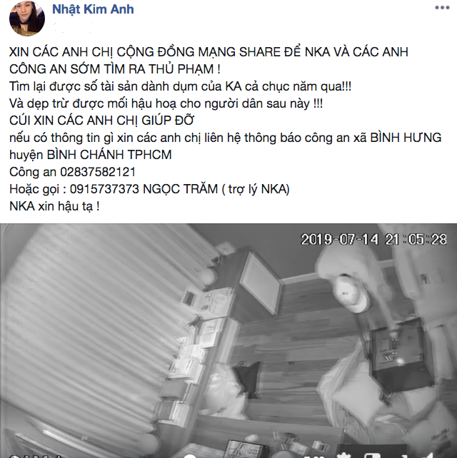 Trong dòng trạng thái, cô viết: “Xin các anh chị cộng đồng mạng chia sẻ để Nhật Kim Anh và các anh công an sớm tìm ra thủ phạm. Tìm lại được số tài sản dành dụm của Nhật Kim Anh cả chục năm qua và dẹp trừ được mối hậu họa cho người dân sau này. Cúi xin các anh chị giúp đỡ".
