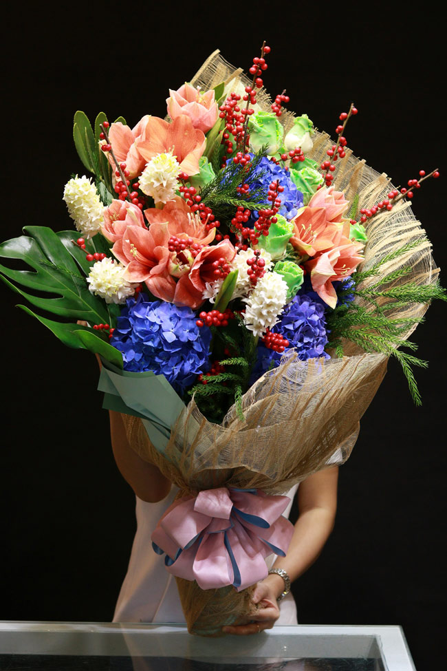 Bên cạnh những cành hồng vàng nguyên chất, dịp 20/10 vừa qua còn xuất hiện những bình hoa, bó hoa nhập ngoại có giá trị từ vài chục triệu đến cả trăm triệu làm quà tặng các chị em.