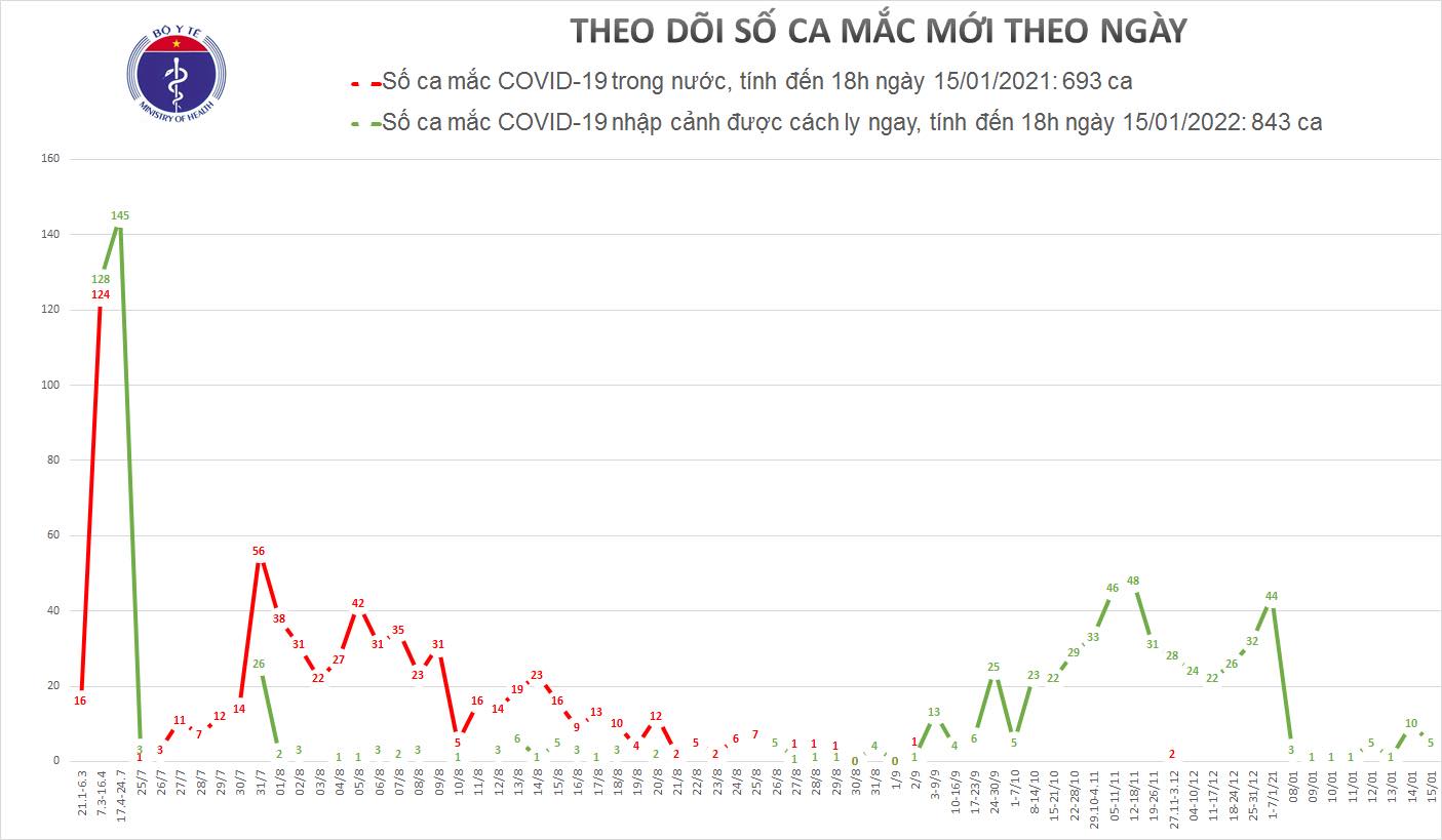 - Tính từ 18h ngày 14/01 đến 18h ngày 15/01: 5 ca mắc mới, đều là các ca nhập cảnh được cách ly ngay.