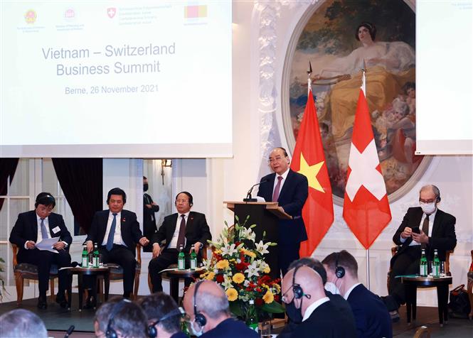 Phát biểu với trên 100 doanh nghiệp hai nước, Chủ tịch nước Nguyễn Xuân Phúc kêu gọi doanh nghiệp Thụy Sỹ đầu tư vào Việt Nam, hợp tác với doanh nghiệp Việt Nam trong các lĩnh vực mà doanh nghiệp Thụy Sỹ có thế mạnh và Việt Nam ưu tiên, đặc biệt trong về tài chính ngân hàng, khoa học công nghệ cao, đổi mới sáng tạo và chuyển đổi số.