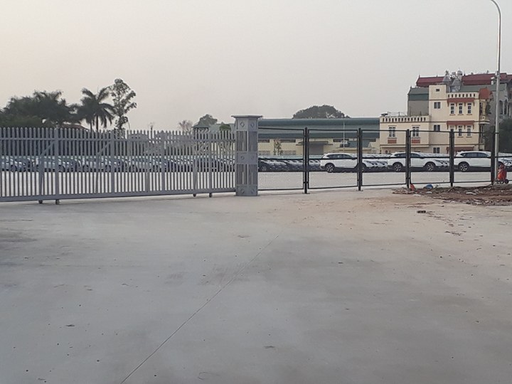 Tuy nhiên, theo quan sát của PV thì hơn 1/2 diện tích khu đất dự án được đổ bê tông và xây hàng rào bằng sắt B40. Ngoài cửa chính được xây dựng bằng hệ thống điện tử tự động, cùng một số bảo vệ chốt trực tại đây. Bên trong, hàng trăm xe ô tô con các loại còn mới chưa gắn biển số, được xếp thành hàng dài bao trọn ô đất.