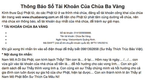 Theo tìm hiểu của Thanh Niên, chùa Ba Vàng có nhiều kênh truyền thông qua mạng xã hội, điện thoại đường dây nóng, website… và thu hút hàng triệu lượt người theo dõi. Chùa này cũng công khai tài khoản ngân hàng để nhận tiền công đức.