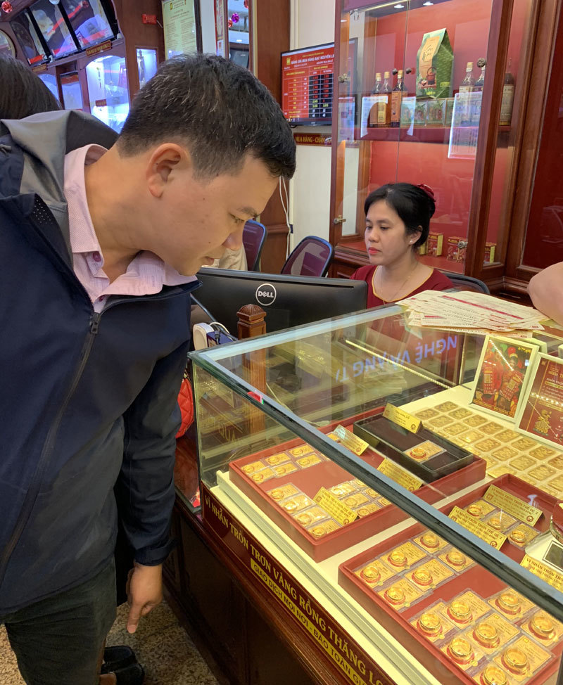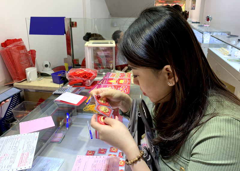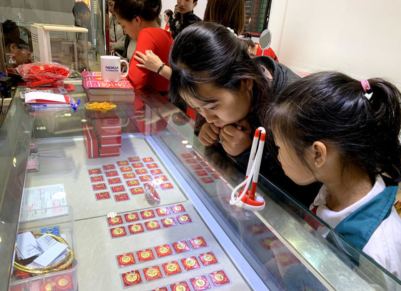 Tại các cửa hàng vàng của DOJI, Bảo Tín Minh Châu, Phú Quý, dù chưa đến mức phải xếp hàng dài và chờ cả vài tiếng như ngày vía Thần Tài năm 2018, nhưng vào trưa ngày mùng 9 tháng Giêng khách cũng phải chen chân nhau chờ mua vàng lấy may.