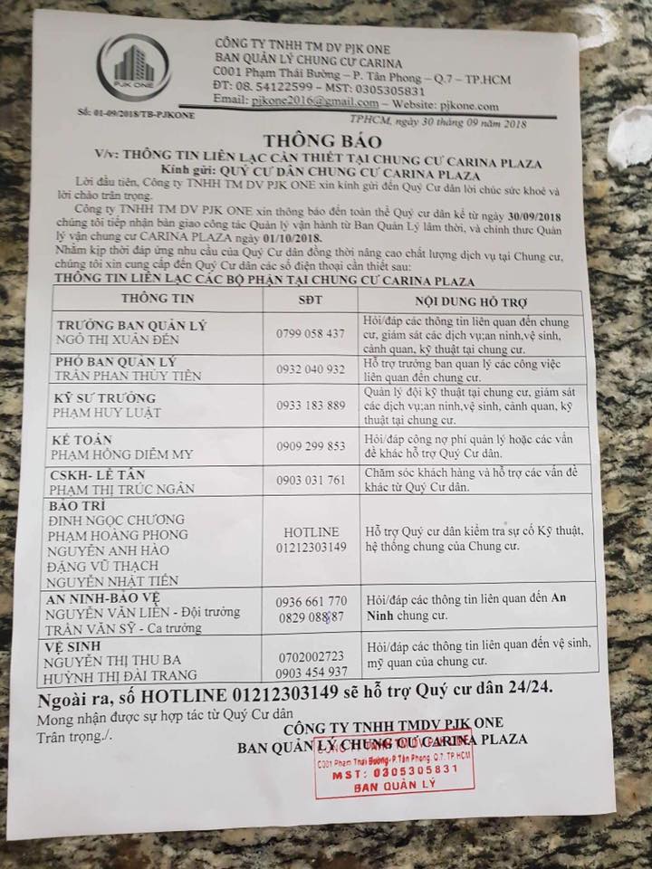 “Trong suốt thời gian qua, ban Quản lý đã nỗ lực để cải thiện chất lượng dịch vụ, nâng cao chất lượng môi trường sống của quý cư dân tại chung cư Carina. Tuy nhiên, khó tránh khỏi những thiếu sót trong việc quản lý và vận hành tòa nhà”, thông báo dừng hoạt động của SEJCO do ông Đào Thanh Minh ký viết.