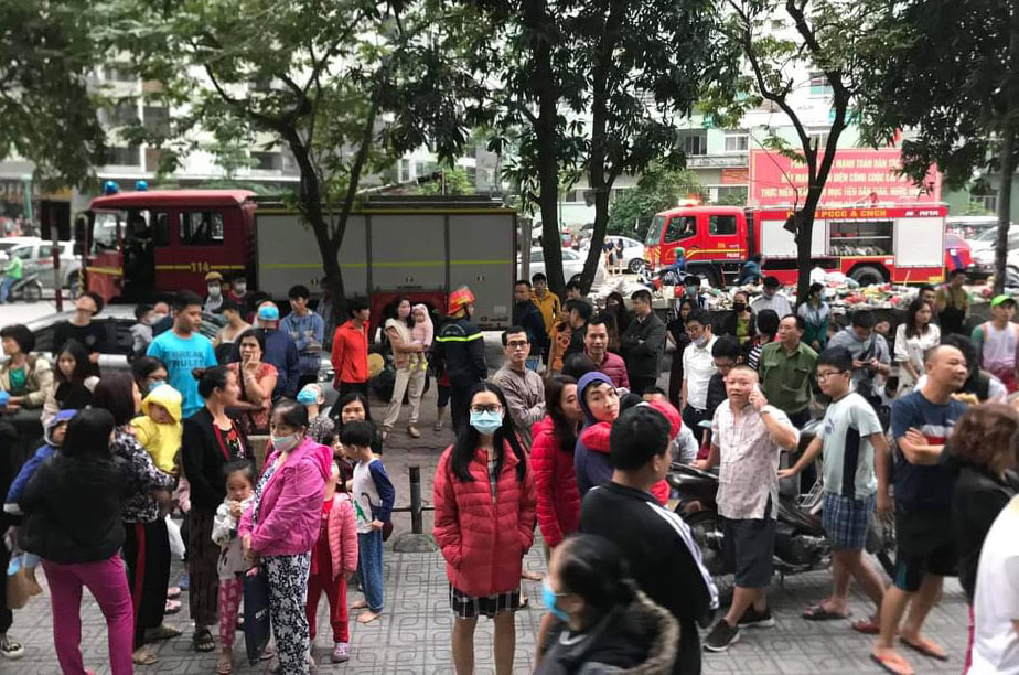 Ngay lập tức, bảo vệ tòa nhà nhanh chóng báo lực lượng cứu hỏa tới hiện trường đồng thời phát loa yêu cầu người dân khẩn trương xuống khu vực tầng 1 tránh ngạt khói.