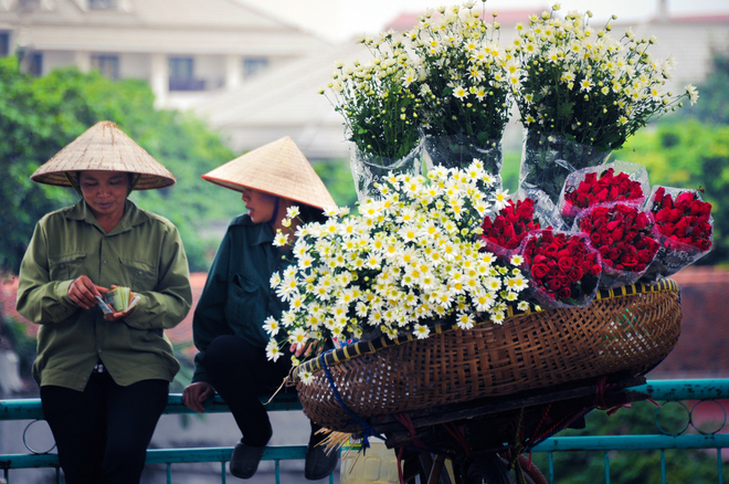 Đấy là những phụ nữ lam lũ. Sáng sớm, hoặc là vào vườn, hoặc là lên chợ hoa Quảng Bá trên đê Nhật Tân, mua hoa rồi xếp vào xe đạp, và bắt đầu cuộc mưu sinh trong ngày. Xếp hoa chủ yếu làm sao được nhiều và lòi hoa ra để khách thấy chứ không phải vì đẹp.