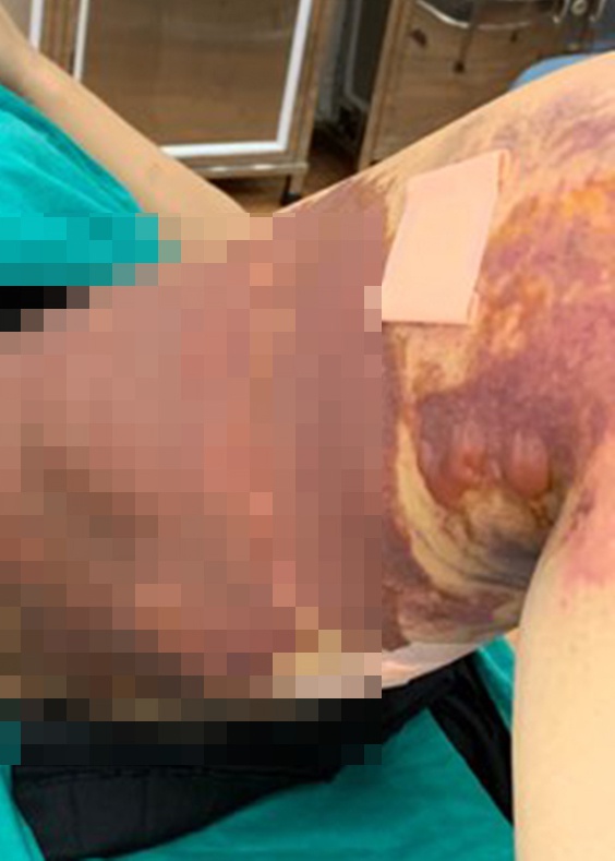 Các bác sĩ chẩn đoán bệnh nhân thiểu dưỡng và hoại tử da do hút mỡ sai nguyên tắc. Nữ bệnh nhân cho biết 8 ngày trước, cô đã đến thực hiện hút mỡ đùi tại Thẩm mỹ viện Việt Hàn (số 83 đường Nguyễn Khang, Hà Nội). Tại cơ sở này, bệnh nhân được thực hiện hút mỡ ở 3 vùng bụng dưới, 2 mặt trong đùi với giá 50 triệu đồng. Sau phẫu thuật, bệnh nhân đau rát nhiều, không khỏi, lo sợ biến chứng nên đã đến Viện Bỏng Quốc gia kiểm tra.