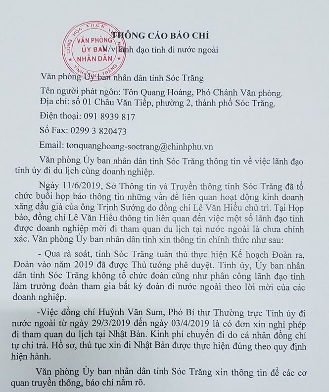 Liên quan đến vấn đề một số lãnh đạo tỉnh được doanh nghiệp ông Trịnh Sướng mời đi tham quan du lịch nước ngoài, ngày 11/6, Sở Thông tin và Truyền thông tỉnh Sóc Trăng tổ chức buổi họp báo do ông Lê Văn Hiểu – Phó Chủ tịch UBND tỉnh Sóc Trăng cho biết thông tin trên là chưa chính xác.