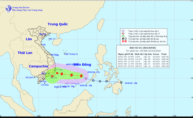 Sáng nay (3/1), sau khi đi vào khu vực phía Đông quần đảo Trường Sa áp thấp nhiệt đới đã mạnh lên thành bão Bolaven (cơn bão số 1 năm 2018).