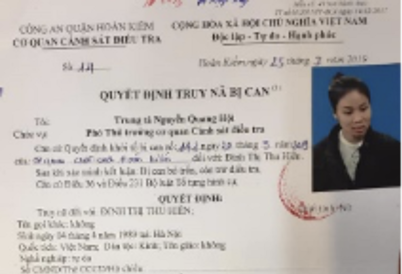 Ngày 25/3/2019, Cơ quan CSĐT Công an quận Hoàn Kiếm đã ra Quyết định truy nã bị can đối với Đinh Thị Thu Hiền.