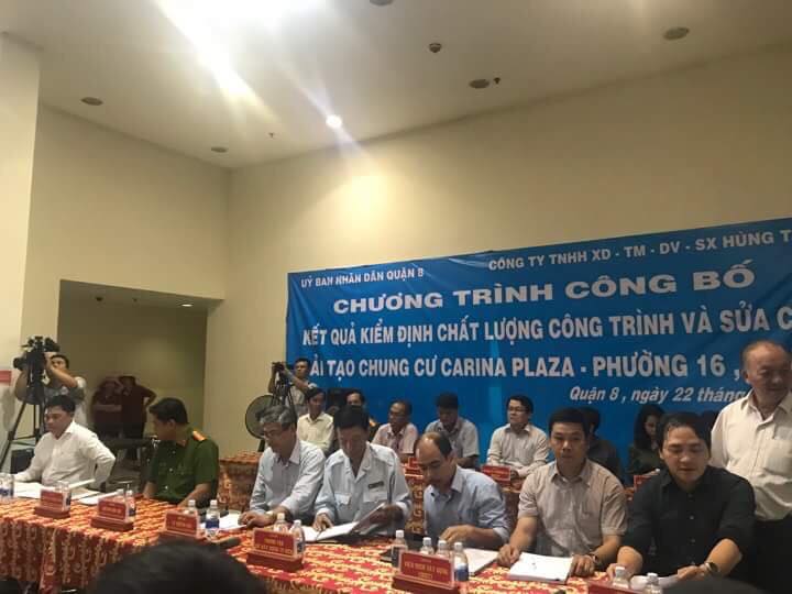 Ngày 22/6, các cơ quan chức năng và chủ đầu tư chung cư Carina Plaza (phường 16,quận 8, TP.HCM) tổ chức công bố kết quả kiểm định và kế hoạch sửa chữa khắc phục hậu quả vụ cháy nghiêm trọng khiến 13 người thiệt mạng và hàng chục người khác bị thương cách đây chưa lâu tại đây.