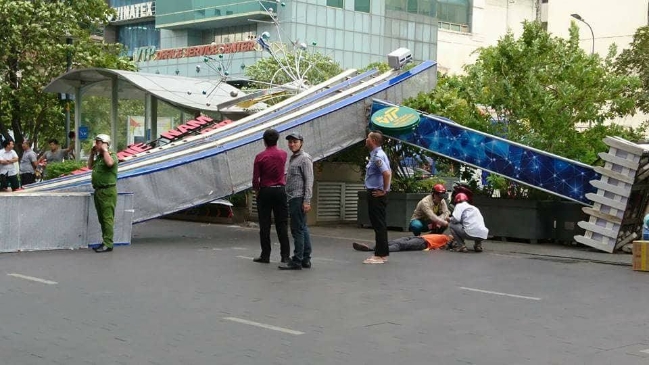 Lúc này, anh Nguyễn Văn Hiếu (SN 1997, ngụ Q.1, TP.HCM) chạy xe máy đi ngang qua nên đã bị các khung sắt đè trúng dẫn đến bị thương. Ngoài ra, 2 ô tô cũng bị đè hư hỏng. Ngay sau đó nạn nhân đã được người dân đưa vào bệnh viện cấp cứu.