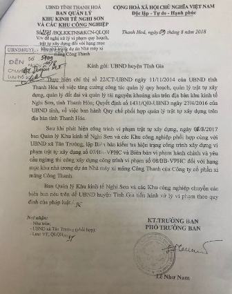 Cụ thể, nội dung văn bản nêu: "Sau khi phát hiện công trình vi phạm trật tự xây dựng, ngày 6/8/2018 BQL KKT Nghi Sơn phối hợp với UBND xã Tân Trường, lập Biên bản kiểm tra hiện trạng công trình xây dựng vi phạm trật tự xây dựng số 07/BB-VPHC và Biên bản vi phạm hành chính, yêu cầu ngừng thi công xây dựng công trình vi phạm số 08/BB-VPHC đối với hạng mục khu nhà trong dự án xi măng Công Thanh của Cty Xi măng Công Thanh.