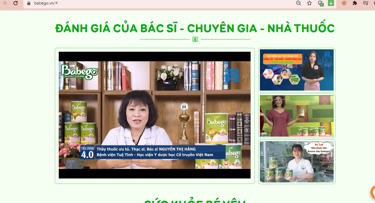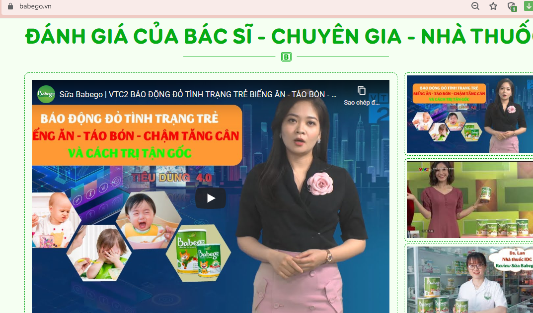 Mặc dù trong giấy tiếp nhận đăng ký số 2600/2020/ĐKSP và giấy xác nhận nội dung quảng cáo số 3614/XNQC-YTHN ghi rõ sản phẩm sữa Babego có công dụng là thay thế bữa ăn phụ và bổ sung cho chế độ ăn hàng ngày thiếu vi chất dinh dưỡng, tuy nhiên, trên website babego.vn lại đăng tải hàng loạt quảng cáo sản phẩm sữa Babego có công dụng như chống táo bón, trị táo bón tận gốc, tăng cân, tăng miễn dịch… khác hoàn toàn so với nội dung quảng cáo đã được cơ quan chức năng có thẩm quyền cấp phép.