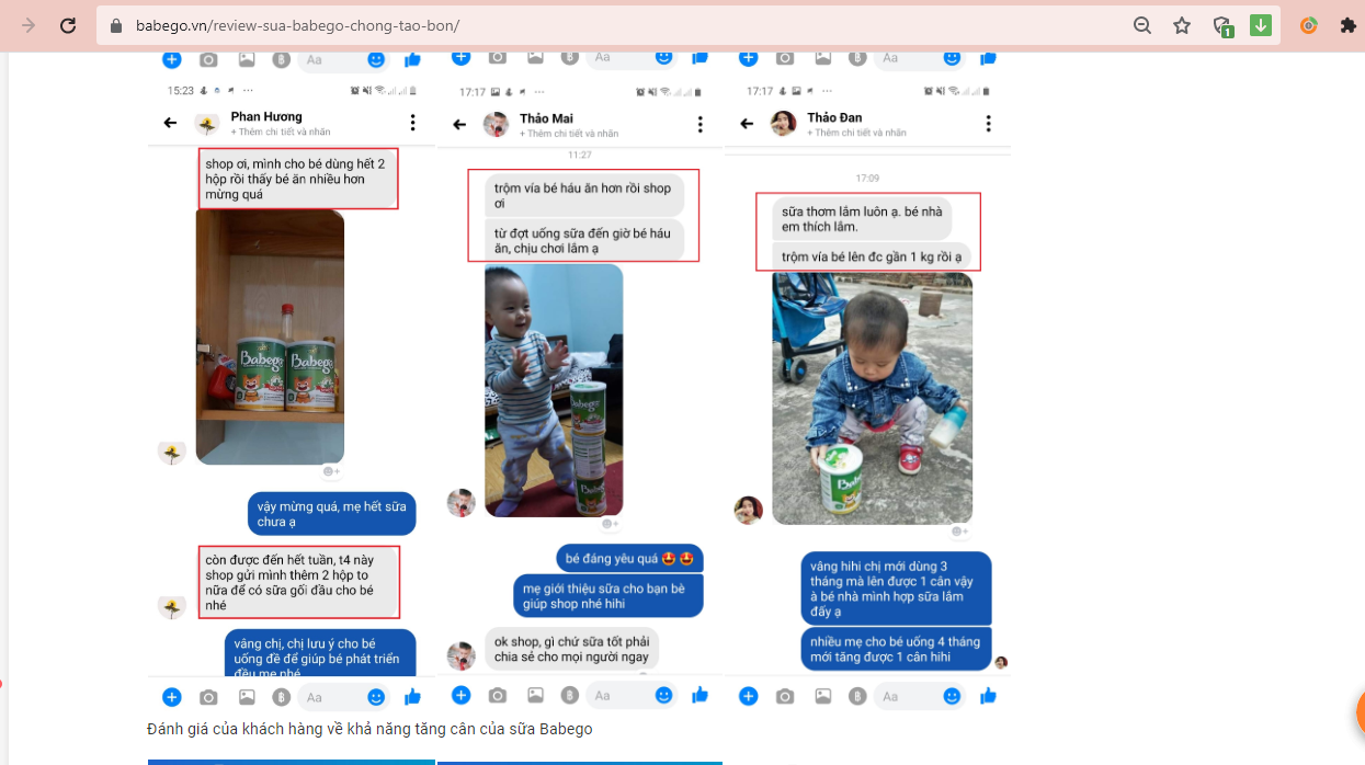 Trao đổi với PV, một khách hàng đã từng mua sản phẩm cho biết: “Tôi thấy trên website babego.vn quảng cáo công dụng sản phẩm sữa Babego dùng để trị táo bón nên đã mua cho bé 2 tuổi nhà tôi sử dụng. Tuy nhiên tình trạng của bé không cải thiện, sữa dinh dưỡng này không có tác dụng thì phải”.
