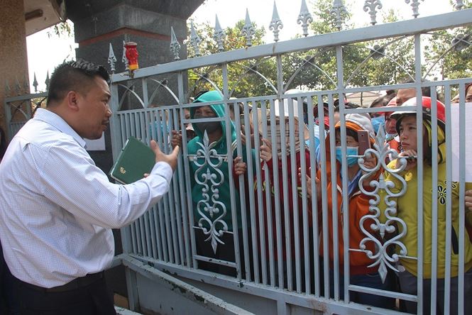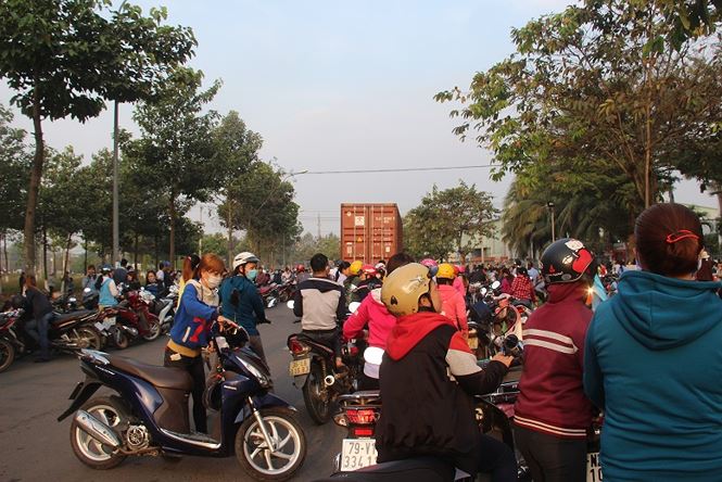 Phía bên trong nhà máy, lực lượng bảo vệ chỉ cho những công nhân chưa nhận tiền hỗ trợ của Liên đoàn lao động (LĐLĐ) tỉnh Đồng Nai và quà tết vào trong khuôn viên công ty, để nhận chế độ. Các công nhân khác đậu xe máy, nằm ngồi la liệt trước khu vực cổng công ty để chờ lãnh đạo.