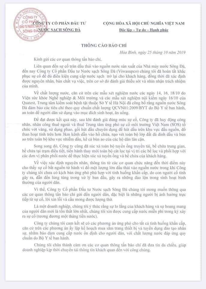 Về chất lượng nước, Viwasupco cho biết kết quả xét nghiệm mẫu nước các ngày 14,16,18/10 do Viện sức khỏe, nghề nghiệp và môi trường cũng như các mẫu xét nghiệm nội kiểm ngày 16/10 của Trung tâm Kiểm soát bệnh tật (Sở Y tế Hà Nội) cho thấy nguồn nước sông Đà đảm bảo các tiêu chí theo quy chuẩn chất lượng của Bộ Y tế.