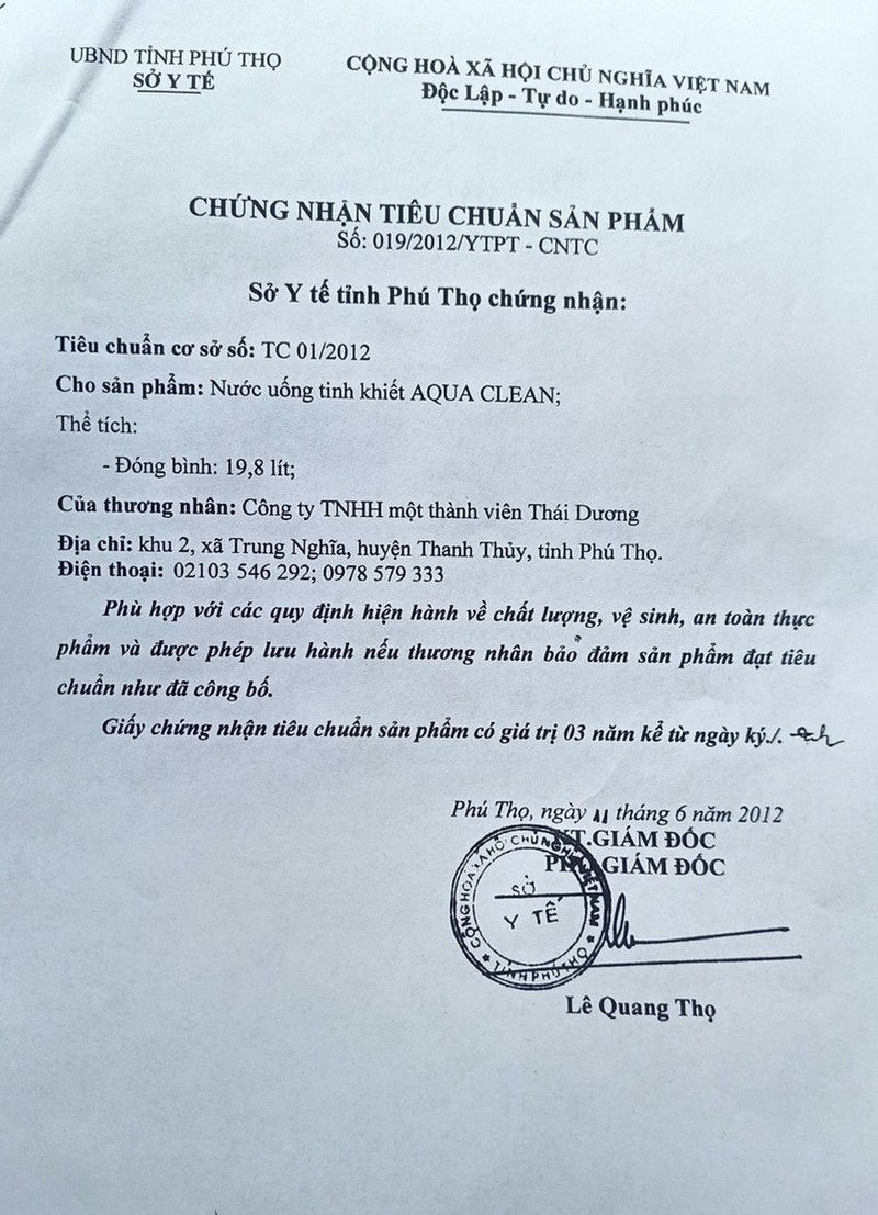 Cụ thể, giấy chứng nhận tiêu chuẩn sản phẩm cấp cho sản phẩm là nước uống tinh khiết AQUA CLEAN đã hết hạn từ năm 2015. Tuy nhiên, đến nay công ty TNHH MTV Thái Dương Phú Thọ vẫn ngang nhiên hoạt động sản xuất, kinh doanh trái phép nước uống tinh khiết đóng bình mang nhãn hiệu AQUA CLEAN.