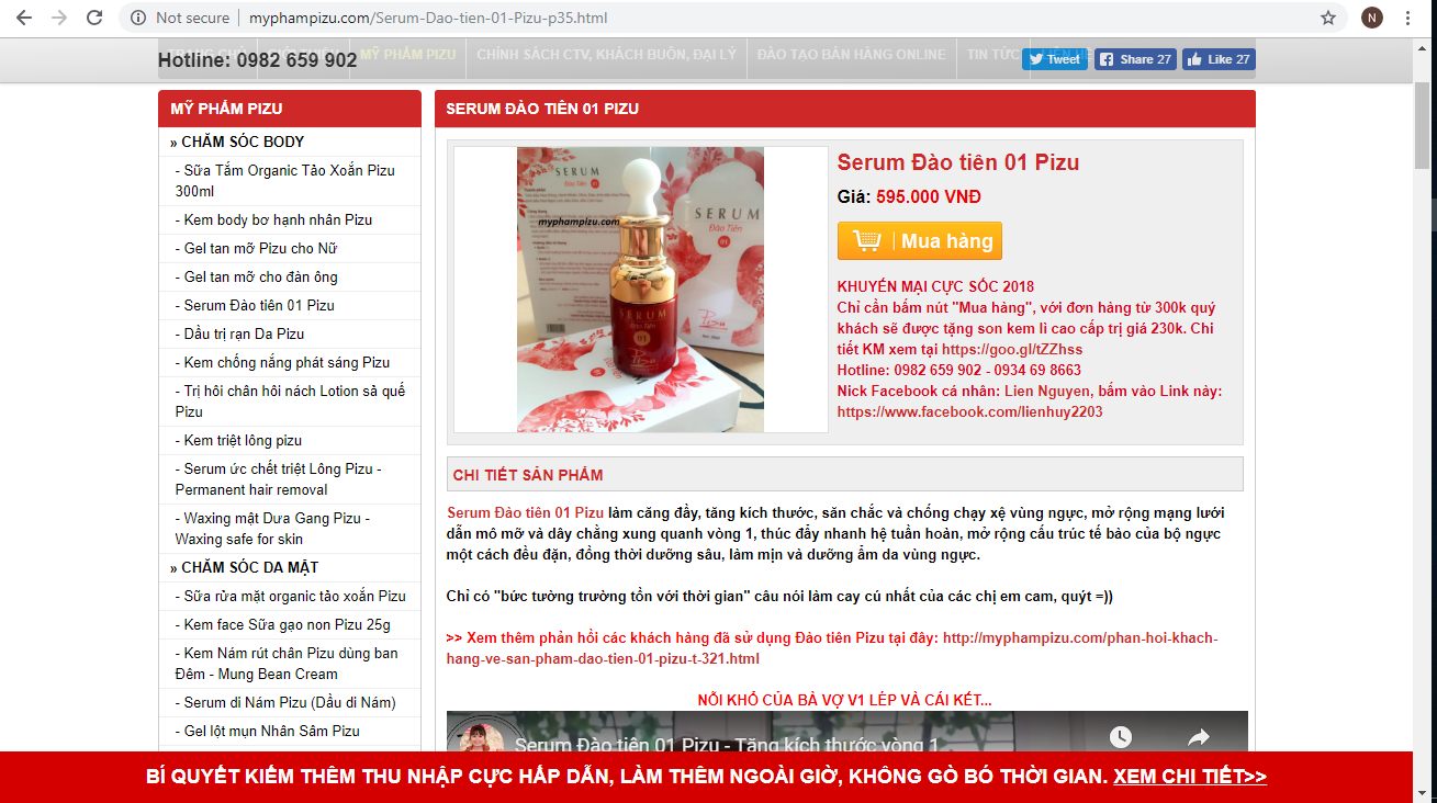 Serum Đào tiên 01 Pizu là sản phẩm mà công ty này đang bán và quảng cáo có tác dụng làm căng đầy, tăng kích thước, săn chắc và chống chảy xệ vùng ngực. Mở rộng mạng lưới dẫn mô mỡ và dây chằng xung quanh vòng 1, mở rộng cấu trúc tế bào của bộ ngực một cách đều đặn”.