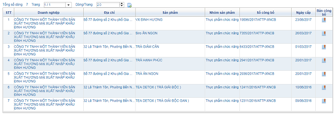 Khi tra cứu trên Cục An toàn thực phẩm, Bộ Y tế, chỉ thấy Công ty TNHH Một thành viên sản xuất Thương mại Xuất nhập khẩu Đinh Hương có 7 sản phẩm có đăng ký bản công bố hợp quy và giấy xác nhận công bố phù hợp quy định an toàn thực phẩm. Còn tất cả các sản phẩm khác của Công ty XNK Đinh Hương vẫn chưa có giấy xác nhận như sản phẩm trà tăng cân, đốt cháy mỡ, giảm mỡ đẹp da, trà giảm cân đẹp dáng…