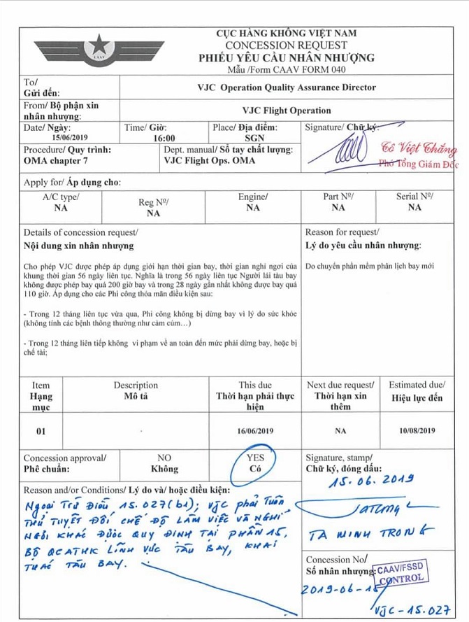 Theo văn bản này, yêu cầu nhân nhượng của VietJet được Cục Hàng không được phê chuẩn bằng chữ ký của ông Tạ Minh Trọng, Phó Trưởng phòng Tiêu chuẩn an toàn bay, Cục Hàng không Việt Nam.