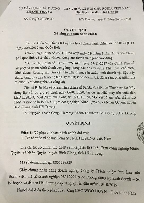Cụ thể, ngày 14/01/2020 Thanh tra Sở Xây dựng tỉnh Hải Dương đã ban hành Quyết định xử phạt vi phạm hành chính số 03/QĐ-XPVPHC đối với Công ty TNHH ILSung Việt Nam vì đã tổ chức thi công xây dựng các công trình không có giấy phép xây dựng mà theo quy định phải có giấy phép xây dựng đối với xây dựng công trình có yêu cầu phải lập dự án đầu tư xây dựng (Các công trình: Nhà kho số 2, nhà xưởng và văn phòng, căng tin) với mức phạt là 50.000.000 đồng.