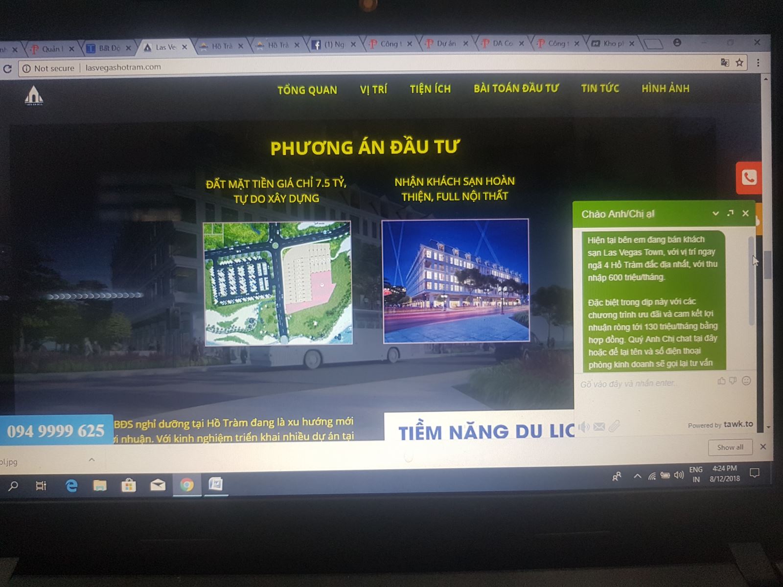 Theo ghi nhận thực tế của PV tại vị trí dự án, hiện nay, toàn bộ dự án này vẫn đang chỉ là bãi đất trống với các tấm pano quảng cáo được dựng lên nhằm giới thiệu về dự án Lasvegas Hotel đang được mở bán với giá từ 1,4 tỷ đồng, chỉ còn 10 nền. Trong vai khách hàng có nhu cầu đầu tư, sau khi gửi lại thông tin cá nhân trên website của công ty, chỉ khoảng 15 phút sau đó, PV đã nhận được điện thoại tư vấn của 1 người đàn ông tên Tráng (tự nhận là nhân viên của công ty) giới thiệu chi tiết hơn về dự án này.