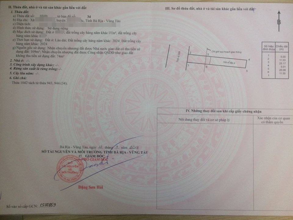 Bên cạnh đó, ông Hạnh có gửi kèm theo Giấy chứng nhận Quyền sử dụng đất (GCNQSD đất) của 1 nền đất mang số hiệu 1042 thuộc tờ bản đồ số 34, sơ đồ vị trí thửa đất tỷ lệ 1/1000 với người đứng tên là ông Trần Hữu Phương. Căn cứ theo GCNQSD đất tại thửa số 1042, tổng diện tích đất là 183m2, trong đó đất ở (lâu dài) sẽ có diện tích 109m2, diện tích đất còn lại bao gồm đất trồng cây hàng năm 17m2, đất trồng cây khác 57m2 được sử dụng đến năm 2024 (phần diện tích đất 74m2 bao gồm đất trồng cây khác sẽ không bị thu tiền sử dụng khi nhận chuyển nhượng đất được công nhận QSDĐ).