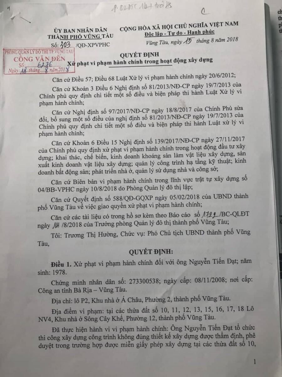 Mới đây, Phòng quản lý đô thị TP. Vũng Tàu đã chính thức cung cấp tới PV Quyết định số 303/QĐ – XPVPHC về xử phạt vi phạm hành chính trong họa động xây dựng của UBND TP.Vũng Tàu, do Phó chủ tịch TP. Vũng tàu ký, ban hành ngày 15/8/2018.