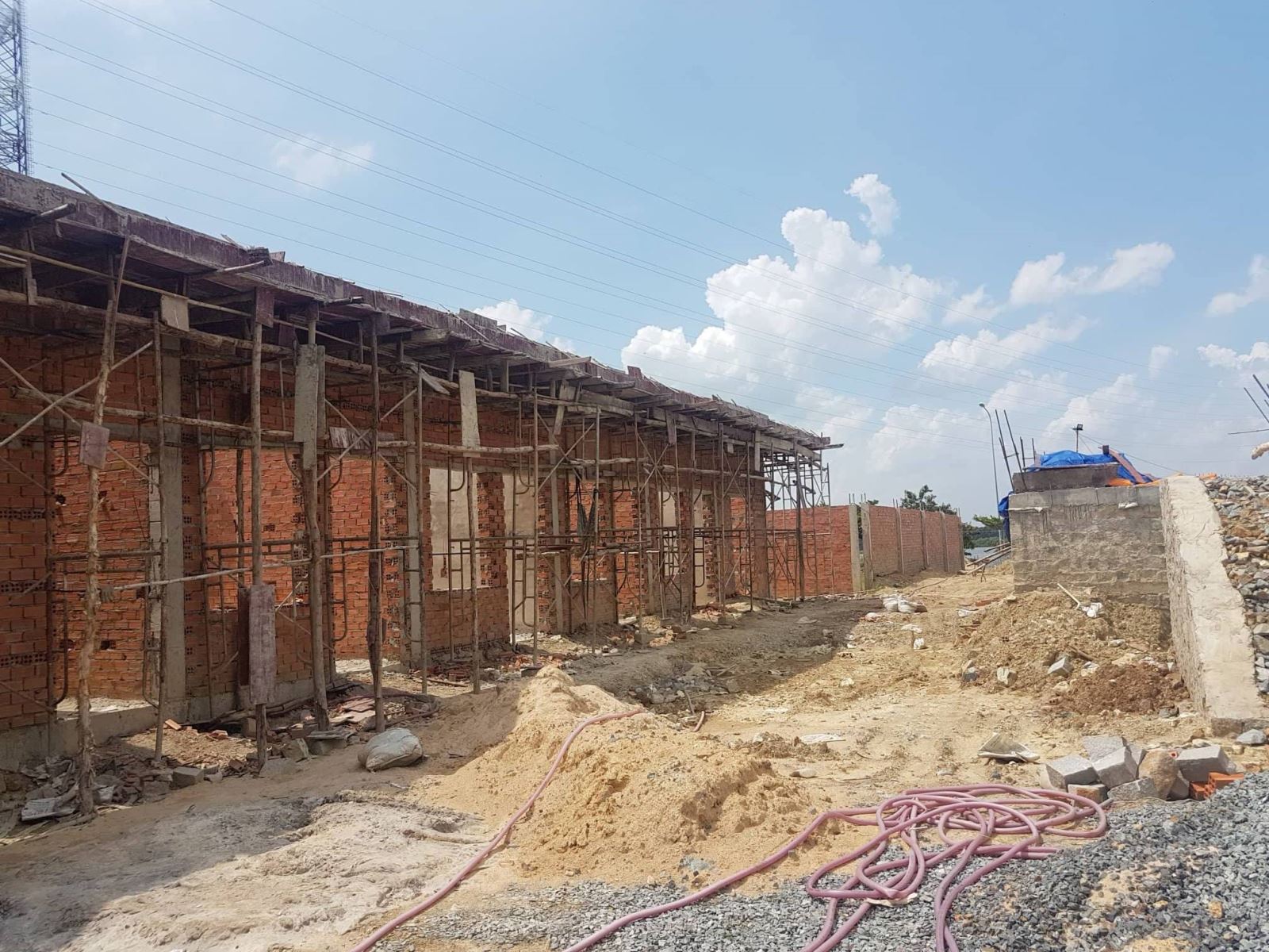 Bên trong công trình, chủ đầu tư đang tiến hành xây dựng các phòng nhỏ nối liền nhau vào khoảng 200m2, còn phần lớn diện tích còn lại chủ đầu tư đang tiến hành đổ một khối đế bê tông cao khoảng hơn 1m so với mặt đất, các vật liệu để dùng cho dự án được chủ đầu tư tập kết ngay trên đường nội bộ của khu dân cư. Tìm hiểu thông tin, PV được biết công trình đang được xây dựng nêu trên là của Công ty cổ phần đầu tư xây dựng sản xuất Tân Thành.