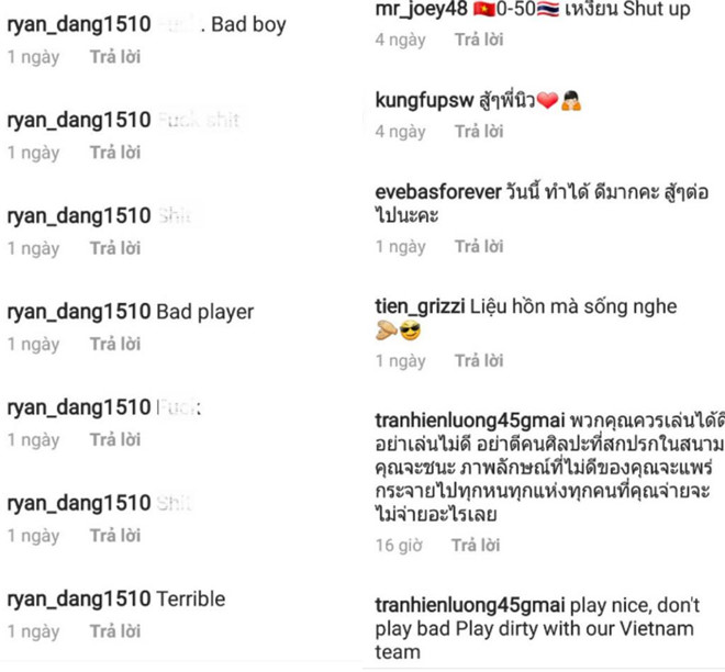 “Liệu hồn mà sống. Cầu thủ chứ có phải là cái bao bố cho mày đá đâu”; “Đá xấu như đấu vật”; “Fair play đi, chơi đá bóng hay đánh người vậy”…. Cổ động viên Việt bức xúc.