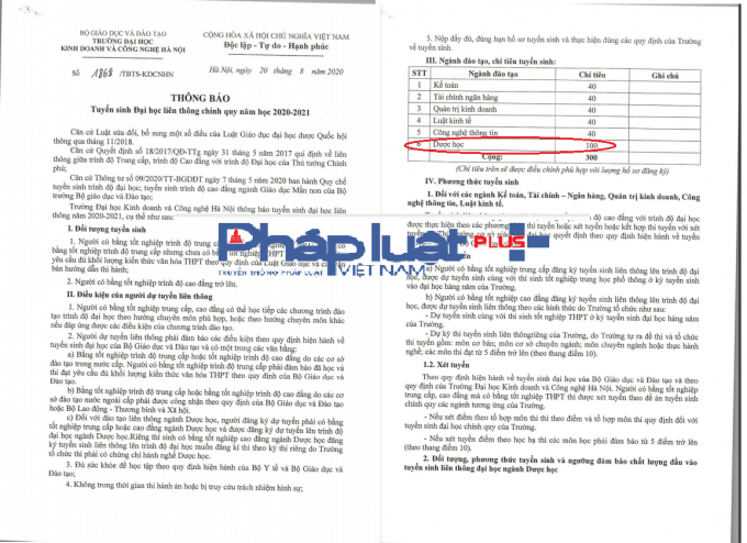 Do vậy ngày 14/9/2020 Bộ Giáo dục và Đào tạo đã có công văn số 3374/ BGDĐT- GDĐH yêu cầu Trường ĐH KD&CN Hà Nội dừng ngay việc tuyển sinh đào tạo liên thông nghành Dược sai quy định, không thực hiện lin kết đào tạo đối với các nghành thuộc lĩnh vực sức khỏe có cấp chứng chỉ hành nghề. Ngoài ra Trường ĐH KD&CN Hà Nội phải báo cáo chi tiết việc tổ chức liên thông đào tạo nghành Dược theo từng năm (kể từ năm 2015 đến nay).