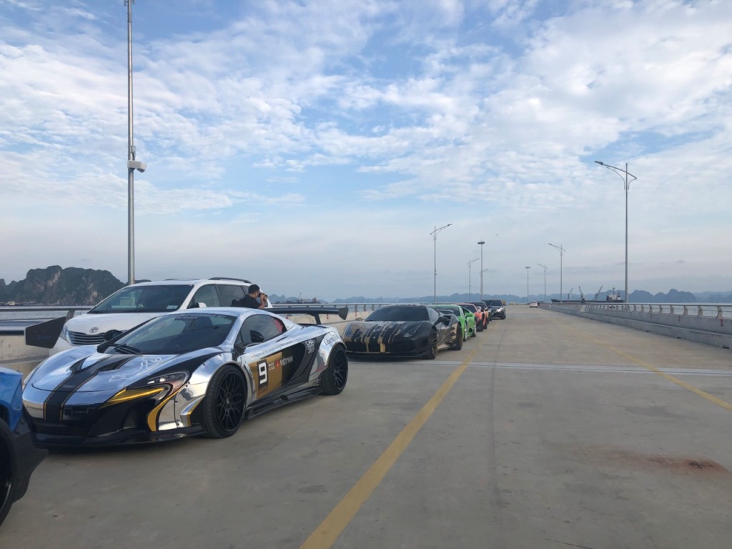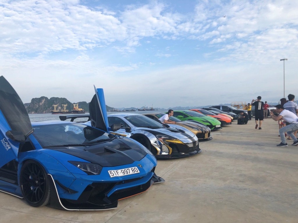 Đoàn siêu xe đậu dọc trên cầu tàu đã thu hút sự chú ý của đông đảo người đam mê siêu xe tại Quảng Ninh cũng như du khách. Không ít người tranh thủ chụp những bức hình kỉ niệm bên những chiếc siêu xe trị giá hàng chục tỉ đồng.