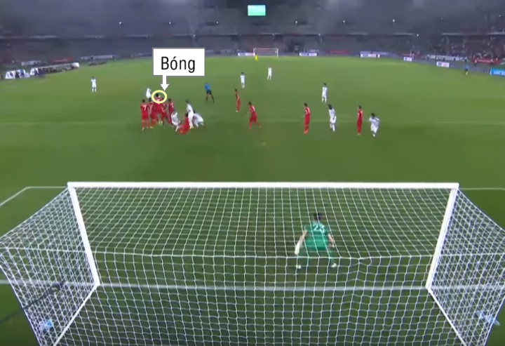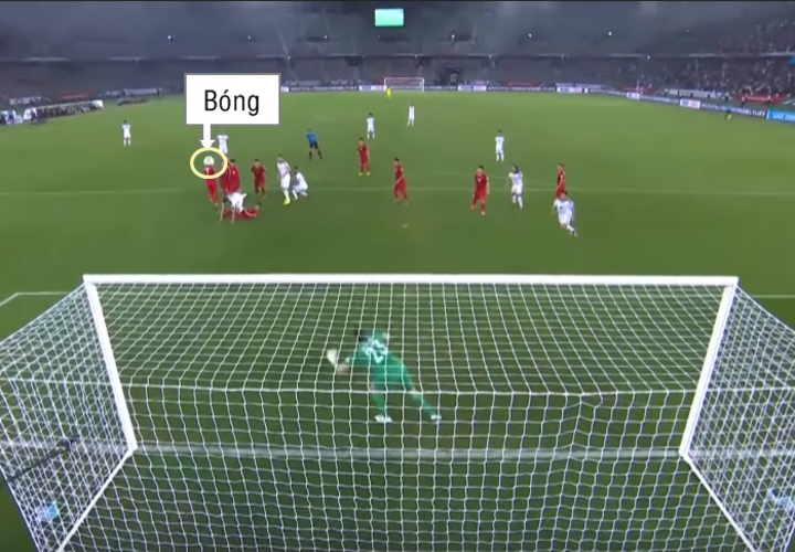 Khi lập hàng rào, nguyên tắc của thủ môn là phải tin tưởng tuyệt đối rằng đối phương sẽ không thể sút xuyên qua hàng rào để đi vào khu vực được bảo vệ (ở trong hình là khu vực màu đỏ). Thủ môn chỉ phải lo bảo vệ khu vực màu vàng. Một nguyên tắc khác là thủ môn phải luôn quan sát được bóng. Đó là lý do tất cả các thủ môn, không chỉ Văn Lâm, luôn đứng lệch hẳn về một phía, tạm gọi là phía xa bóng. Thủ thành của Việt Nam, vì thế, đã không sai ở khâu chọn vị trí và lập hàng rào.
