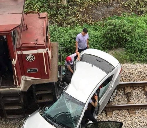 Vụ va chạm làm xe ô tô 34A- 066.13 bị hư hỏng nặng, đầu tàu hỏa bị hư hỏng nhẹ.