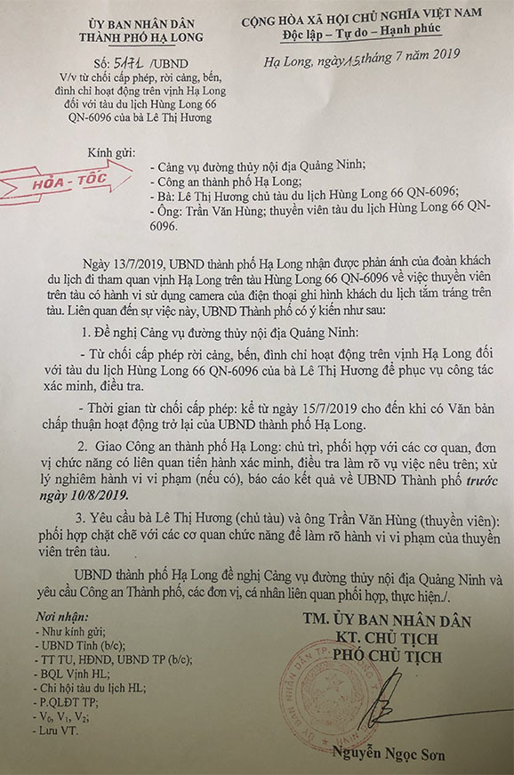 Hôm nay, UBND TP Hạ Long ra văn bản đình chỉ tàu Hùng Long trên vịnh Hạ Long, từ chối cấp phép việc rời cảng bến. Tàu Hùng Long 66 bị đình chỉ từ ngày 15/7 đến khi được UBND thành phố Hạ Long có văn bản chấp thuận cho hoạt động trở lại. UBND thành phố Hạ Long cũng đề nghị cơ quan công an vào cuộc để xử lý nghiêm hành vi của thuyền viên tàu Hùng Long 66.