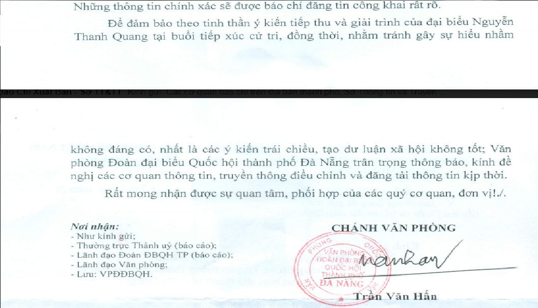 Ngày 28/4, văn phòng Đoàn Đại biểu Quốc hội (ĐBQH) TP.Đà Nẵng phát đi thông báo việc làm rõ nội dung đã tiếp thu, giải trình của ĐBQH. Thông báo này do Chánh văn phòng Đoàn ĐBQH TP.Đà Nẵng Trần Văn Huấn ký.