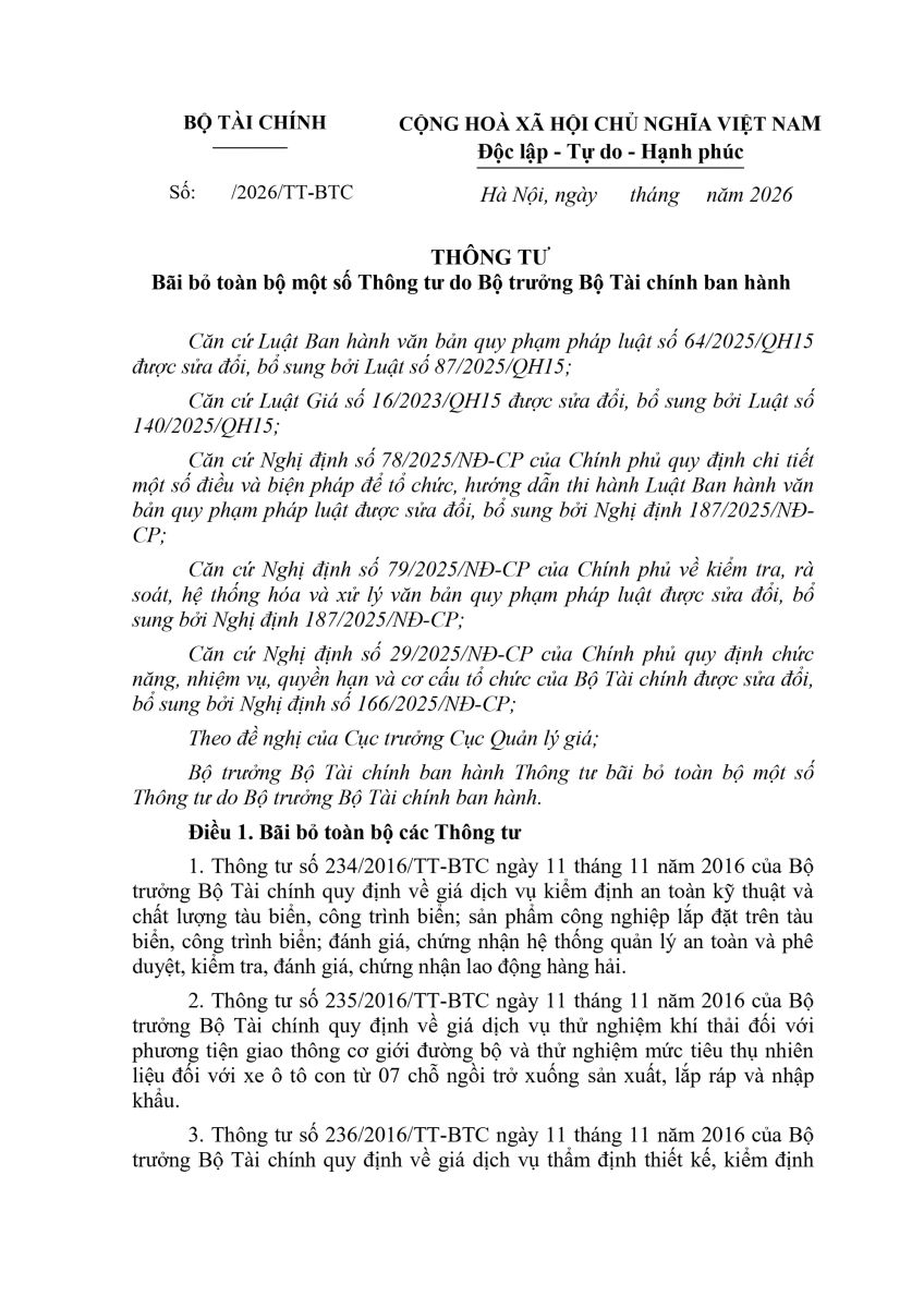 TOÀN VĂN: Dự thảo Thông tư bãi bỏ toàn bộ một số Thông tư do Bộ trưởng Bộ Tài chính ban hành.