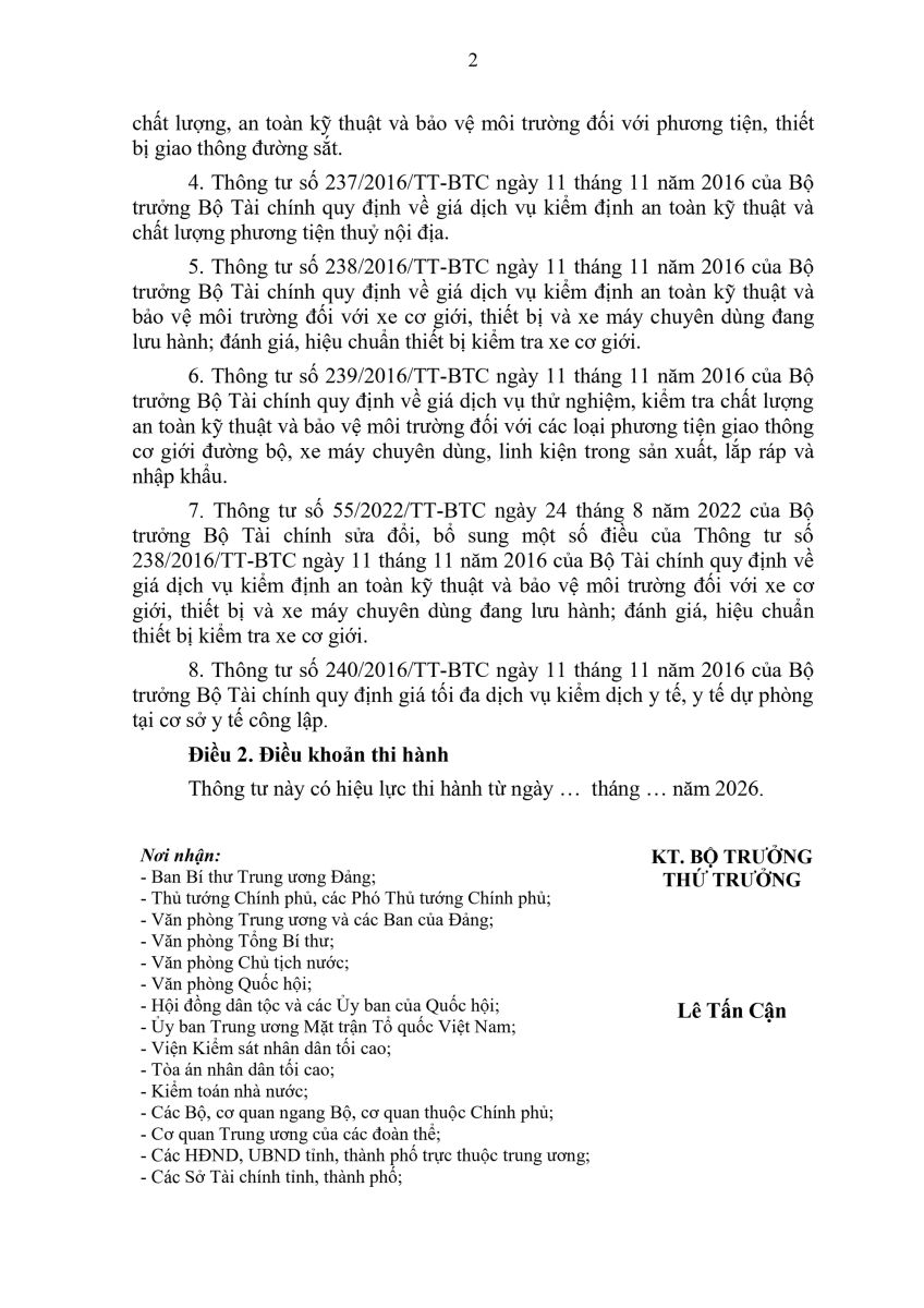 7. Thông tư số 55/2022/TT-BTC ngày 24 tháng 8 năm 2022 của Bộ trưởng Bộ Tài chính sửa đổi, bổ sung một số điều của Thông tư số 238/2016/TT-BTC ngày 11 tháng 11 năm 2016 của Bộ Tài chính quy định về giá dịch vụ kiểm định an toàn kỹ thuật và bảo vệ môi trường đối với xe cơ giới, thiết bị và xe máy chuyên dùng đang lưu hành; đánh giá, hiệu chuẩn thiết bị kiểm tra xe cơ giới.