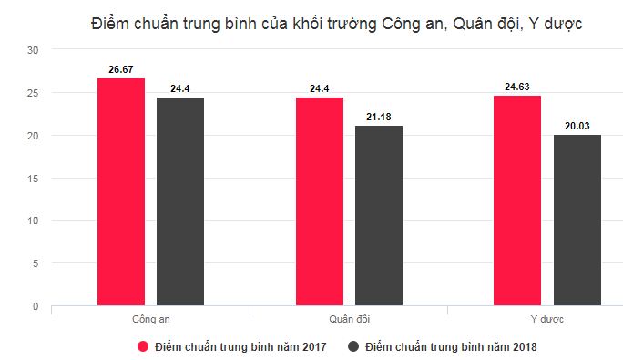 Ở khối quân sự, hai trường có điểm chuẩn 30 trong năm 2017, năm nay có số điểm tương ứng là 25,1 (Học viện Kỹ thuật Quân sự ) và 26,35 điểm (Học viện Quân y).