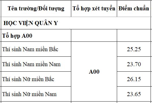 Cụ thể, điểm trúng tuyển các khối ngành của học viện Quân y như sau: