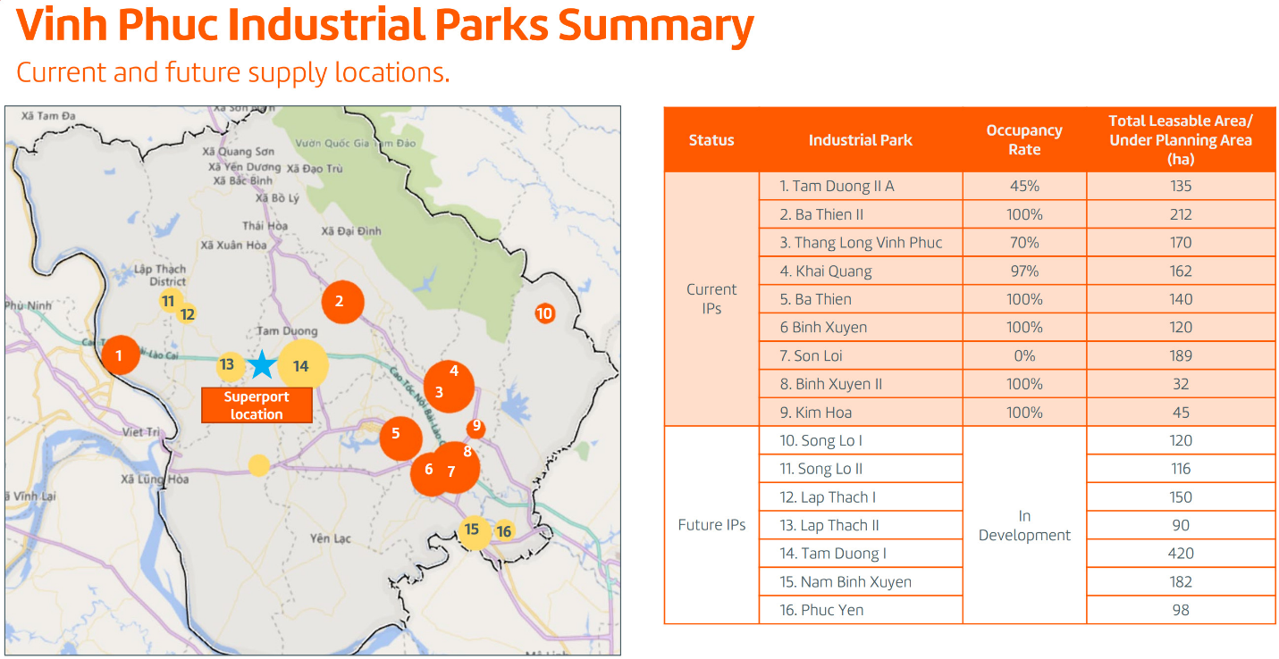 Trên địa bàn tỉnh Vĩnh Phúc hiện nay có 9 khu công nghiệp với tổng diện tích cho thuê hơn 1.200 ha. Riêng huyện Bình Xuyên đã tập trung 6 khu công nghiệp bao gồm Bá Thiện 1, Bá Thiện 2, Thăng Long Vĩnh Phúc, KCN Bình Xuyên, Bình Xuyên 2, Sơn Lôi. Theo kế hoạch, tỉnh Vĩnh Phúc sẽ phát triển thêm 7 Khu công nghiệp với tổng diện tích cho thuê 1.176 ha.