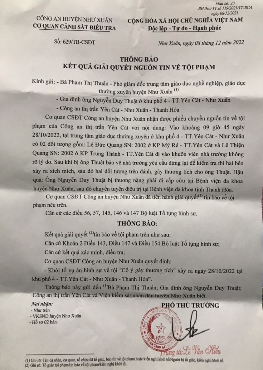 Kết quả trưng cầu giám định của Cơ quan CSĐT Công an huyện Như Xuân xác định ông Nguyễn Duy Thuật bị tổn thương 23% sức khỏe.