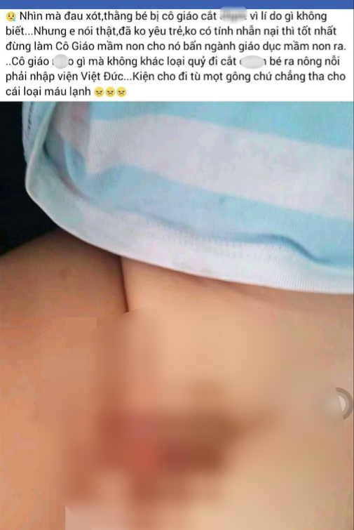 Trên mạng xã hội lan truyền một đoạn clip và hình ảnh ghi lại cảnh một bé trai được gia đình cho đi học ở nhà trẻ tư thuộc xã Tiền Phong, huyện Thường Tín (Hà Nội) khi bé trai được gia đình đón về thì bất ngờ phát hiện vùng kín của bé trai bị đứt, phải khâu nhiều mũi.